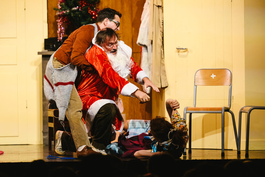 Tout part d’une blague un peu culottée, et d’une folle envie de jouer, toujours ! Un désistement de spectacle pour une soirée du 31 décembre, et ce pari fou, monter en une poignée de répétitions le mythique Père Noël créé par le Splendid. Nous avons plongé dans ce spectacle avec la joie débridée d’enfants retrouvant un jouet préféré. Spectacle vintage, pourrait-on dire ; poussiéreux pourrait-on craindre…