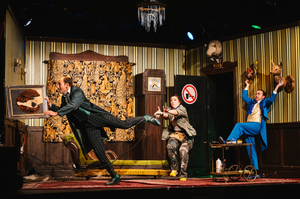 Imaginez 7 amateurs de romans noirs anglais qui décident de créer un spectacle alors qu’ils ne sont jamais montés sur scène ! Ils ont choisi une pièce inédite, un véritable chef d’œuvre écrit par Conan Doyle lui-même (enfin, c’est ce qu’ils prétendent !)… L’action se situe fin XIXème, dans un superbe manoir, lors d’une soirée de fiançailles, en plein cœur de l’Angleterre. Les festivités vont enfin commencer quand un meurtre est commis. Chacun des invités présents dans le château devient alors un dangereux suspect.